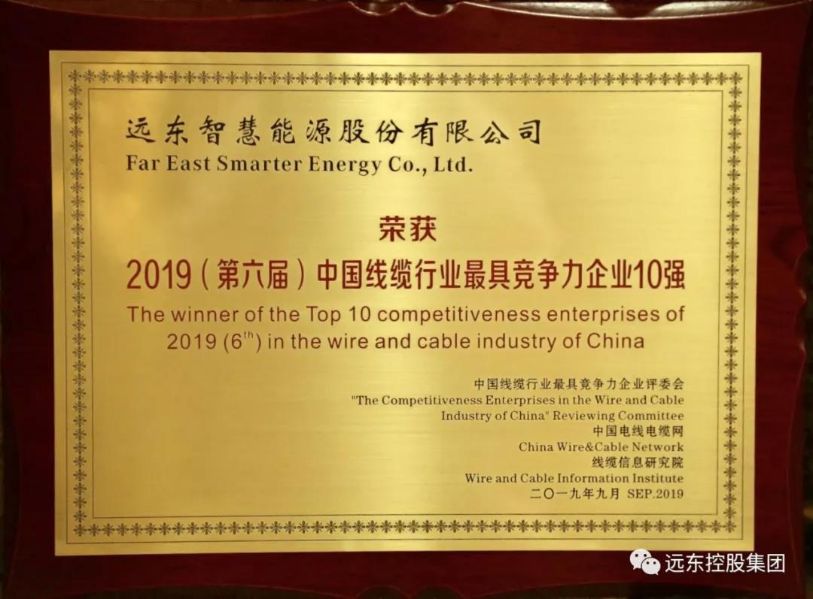 9月2日,由中国电器工业协会电线电缆分会、上海电缆研究所有限公司主办的2019年中国电线电缆行业大会在上海召开,远东智慧能源股份有限公司(简称:智慧能源 股票代码600869)再次荣膺“全国线缆行业最具竞争力10强”。