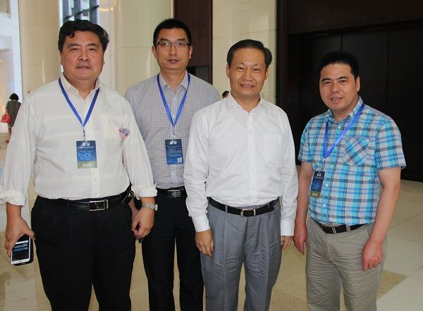 蒋锡培(左三)与第八任秘书长沙祖康(中)、阳光媒体集团主席、董事长杨澜(右三)合影