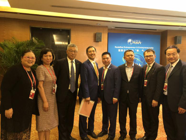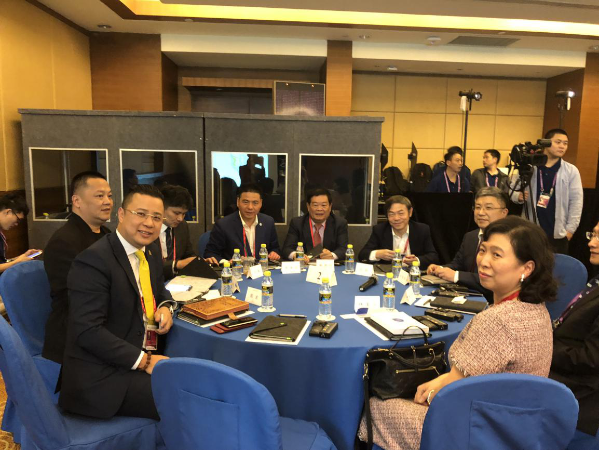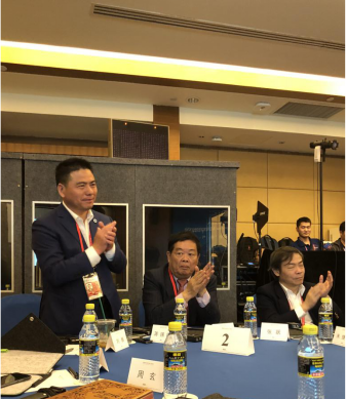 他与国际菁英汇主席胡智荣(左二)、天合光能首席品牌官杨晓忠(左一)共同参会