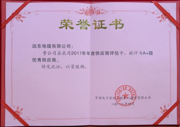 4月13日,远东智慧能源股份有限公司(简称:智慧能源 股票代码:600869)全资子公司远东电缆有限公司(简称:远东电缆)应邀参加中国电子系统工程第二建设有限公司2017年度供应商大会。远东电缆从上百家供应商中脱颖而出,荣获“最佳质量奖”和“A+级优秀供应商”荣誉称号,成为电线电缆行业唯一获此殊荣的企业。