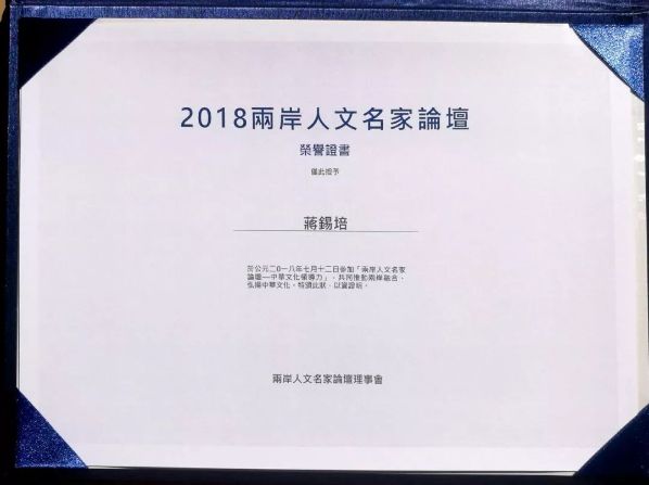 论坛现场,蒋锡培获得了论坛颁发的“中华文化卓越成就奖”和“2018两岸人文名家论坛荣誉证书”。