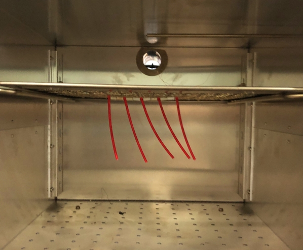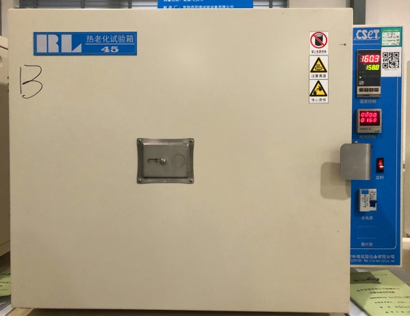实验:将布电线样品放置于老化试验烘箱中,温度设置为158℃,加速试验样品的空气老化,时间设置为168小时。