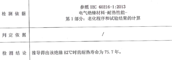 实验结果:耐老化温度高,158℃,7天老化,性能不降低,推导得出,该绝缘82℃时的耐热寿命为75.7年。