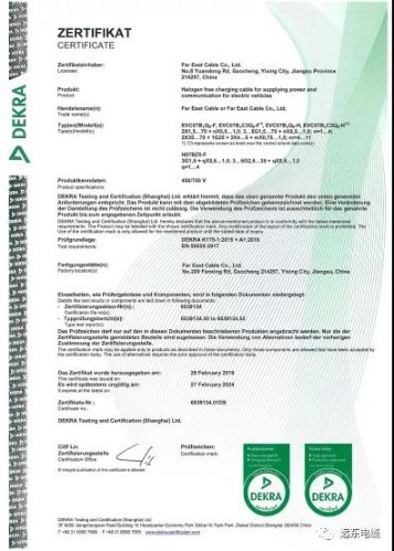 2019年11月,远东电缆委托江苏省工业和信息化厅进行外部鉴定,远东研发的欧标充电桩电缆达到国际先进水平。此外,产品所用材料均满足RoHS法规要求,并取得了TUV和DEKRA认证证书。