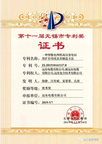近日,远东电缆“一种智能电网特高压变电站用扩径母线及其制造方法”荣获无锡专利奖优秀奖。该专利产品以其优异的性能和技术优势、经济效益,极大地提高了我国导线制造的技术水平。